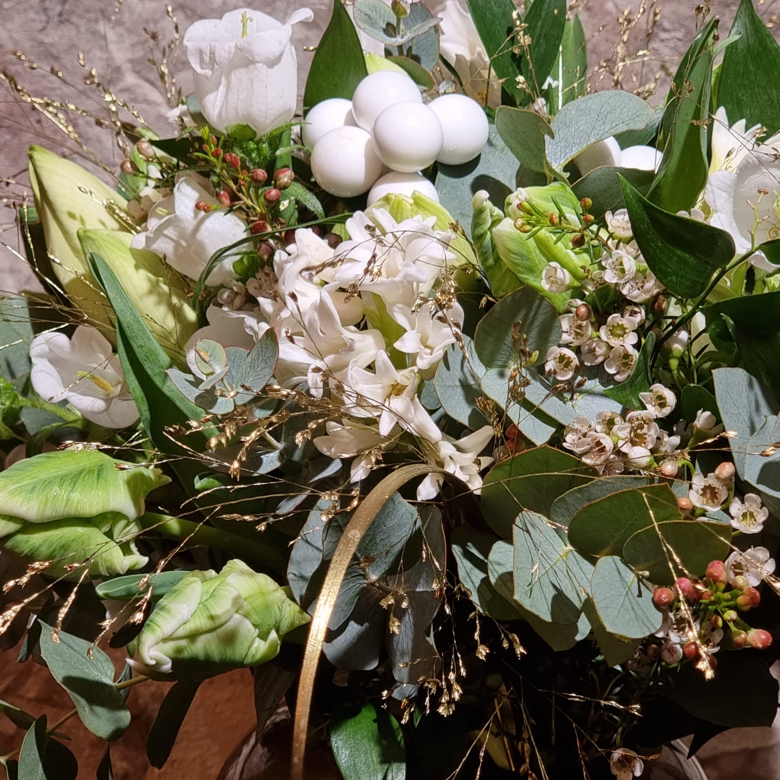 Notre Bouquet festif blanc et or est agrémenté d’accessoires de Noël et confectionné avec des fleurs de saison, choisies en fonction de notre arrivage afin de vous assurer une qualité irréprochable. Il saura mettre en lumière votre intérieur pour cette belle période.